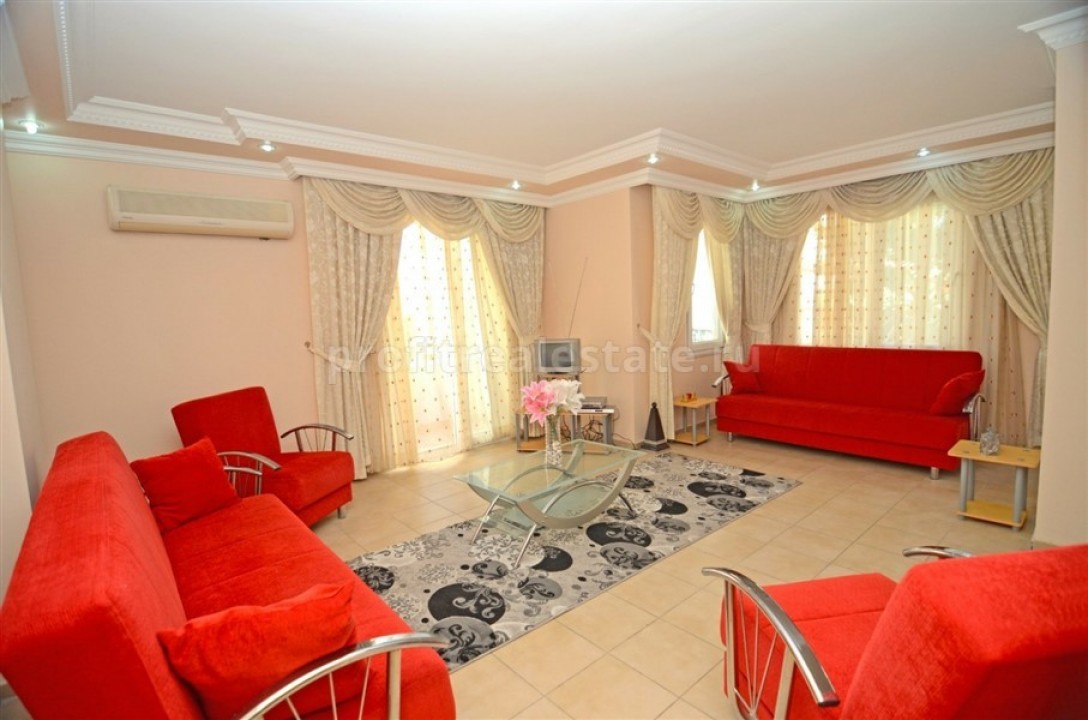 В районе Махмутлар на продажу от собственника выставлена просторная квартира планировки 2+1 и общей площадью 130 м2. В апартаментах две отдельных спальных комнаты, кухня открытого американского типа, которая совмещена с гостиной, две ванных комнаты и три балкона. Важно и очень выгодно, что в стоимость квартиры входит полный комплект мебели и бытовой техники. В каждой комнате предлагаемой квартиры установлен кондиционер, а значит вы как будущий собственник квартиры будете чувствовать себя комфортно в любое время года. Из окон квартиры и балконов (напомним, которых целых 3!) открывается красивый вид оживленную зеленую улицу и инфраструктуру соседних комплексов.