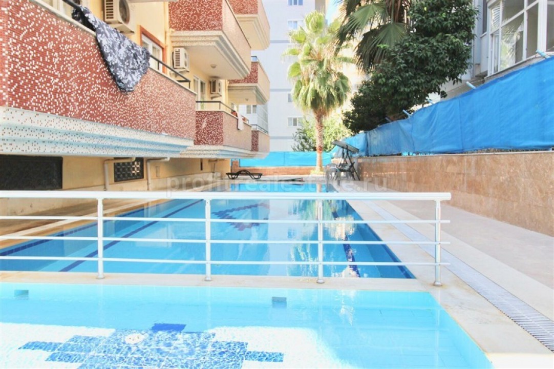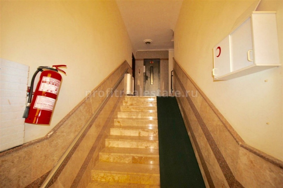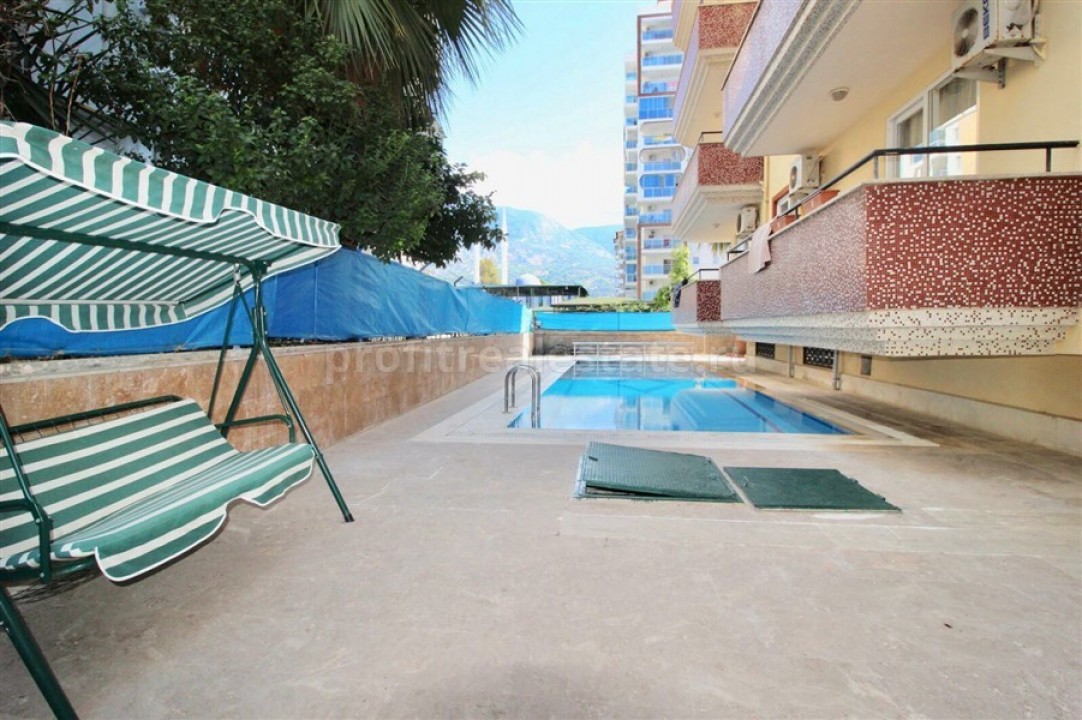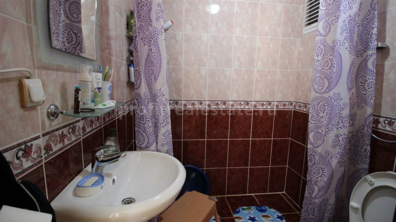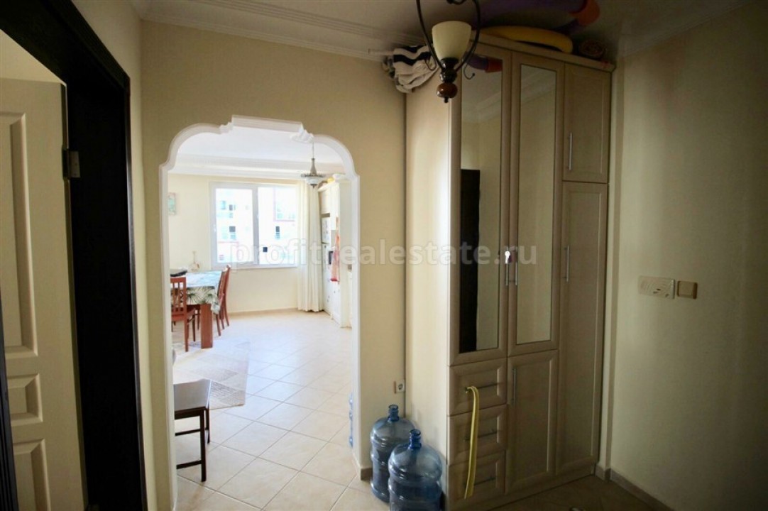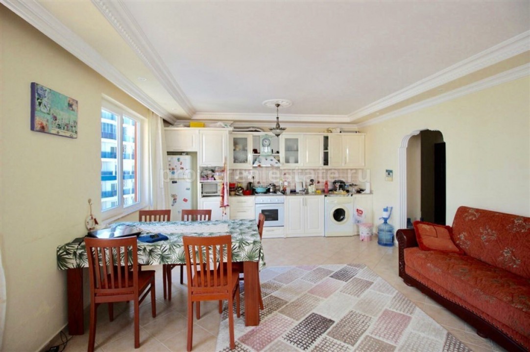 На кухне установлен кухонный гарнитур со встроенным холодильником, духовым шкафом и посудомоечной машиной. Здесь кстати очень удачно поместилась и стиральная машина. В зоне кухни также расположен и обеденный стол со стульями. Гостиная обустроена большим угловым диваном и креслами. В прихожей установлен шкаф для обуви и верхней одежды. В каждой комнате установлены кондиционеры. Из балконов квартиры открывается шикарный вид на горы. Апартаменты расположены на четвертом этаже высотного дома 2008 года постройки. Его инфраструктура представлена бассейном, лифтом, теннисными столами и тренажерным залом. Расстояние до моря составляет всего 250 метров.
