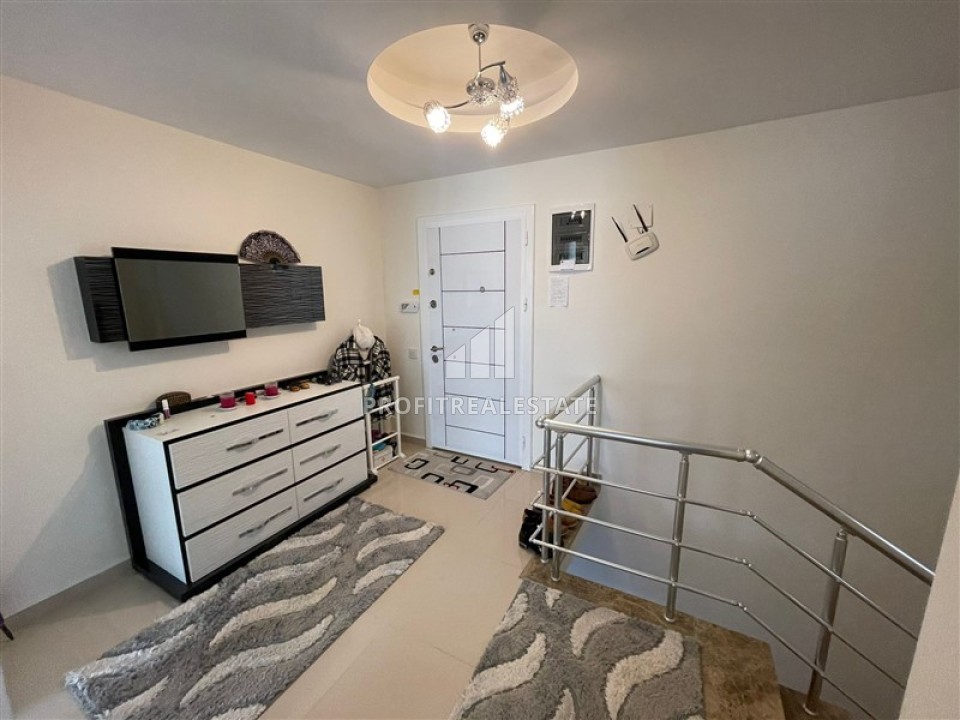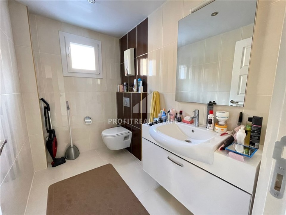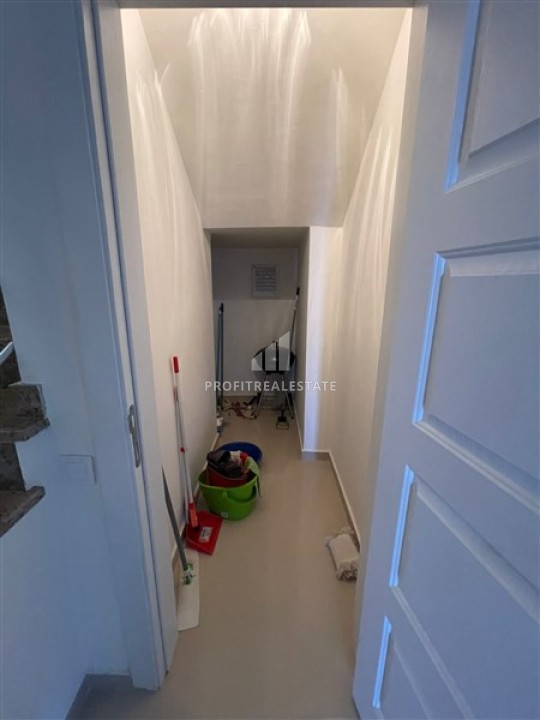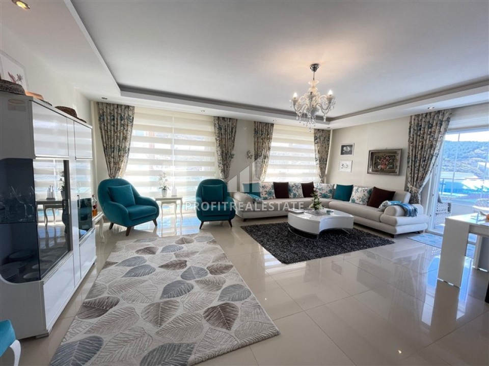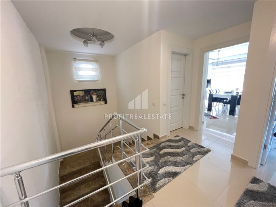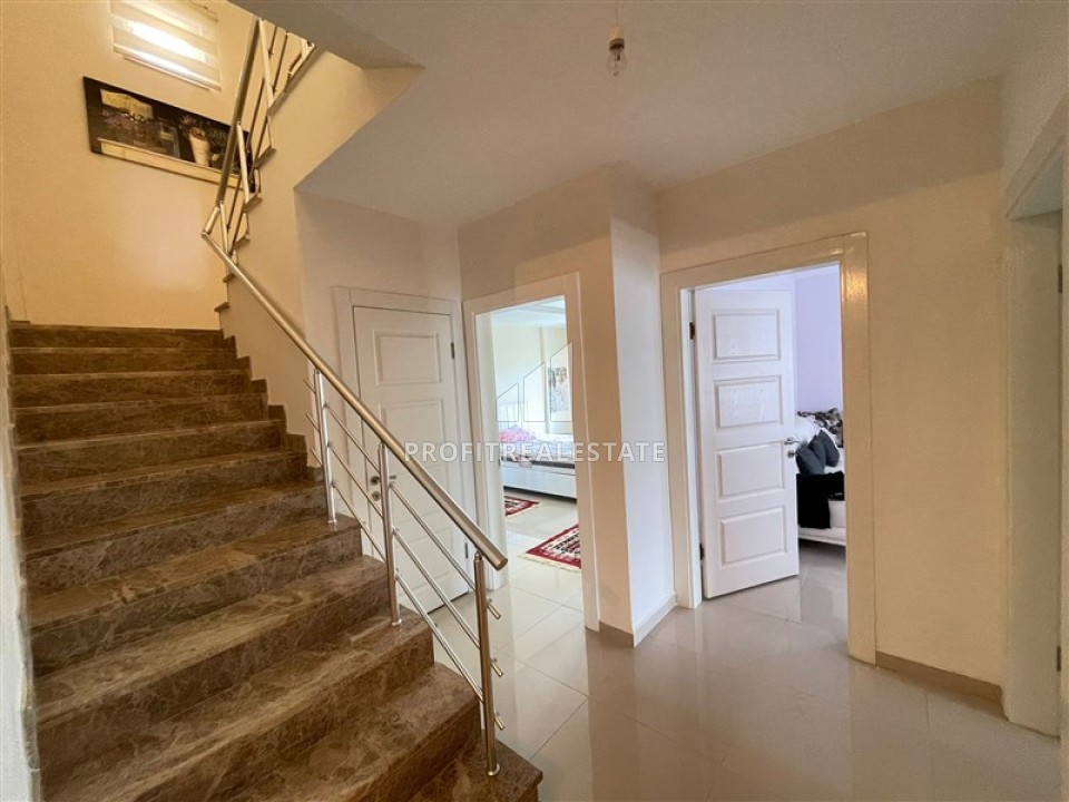 Продается дуплекс 3+1, с 200м² общей площади. Вход в апартаменты находится на верхнем этаже, и вы попадаете в выделенную хорошую зону прихожей с тумбами для обуви. Просторная гостиная с элегантной мягкой мебелью порадует шикарными видами сквозь панорамные окна. Новые владельцы по достоинству оценят просторную отдельную кухню, которая укомплектована корпусной мебелью и полным комплектом необходимой бытовой техники. Здесь же расположилась обеденная зона для большой семьи. В прихожей находится удобная гранитная лестница, спускаясь по которой вы попадаете в приватную зону семьи. Три меблированные спальни, расположенные здесь, имеют прекрасные виды. Три ванные комнаты (по одной на этаже и третья в главной спальне), две - с большими душевыми кабинами, третья – гостевой санузел, укомплектованы местами для хранения и качественным сантехническим оборудованием. Под лестницей разместилась вместительная кладовая. Особого внимания заслуживают два балкона больших размеров на каждом этаже, с великолепным видом на Средиземное море и Торосские горы, живописные окрестности и, лежащий под ногами, район Каргыджак. На балконах обустроены уютные зоны для отдыха и приема пищи, а их остекление позволит любоваться великолепным видом при любой погоде. С балкона нижнего этажа можно выйти прями в сад и, с утренним кофе, вдыхать умопомрачительный воздух и слушать пение птиц в тени деревьев. Дуплекс находится в отличном состоянии, продается с полным комплектом мебели и бытовой техники, которую вы видите на фото.