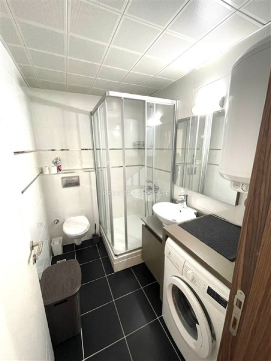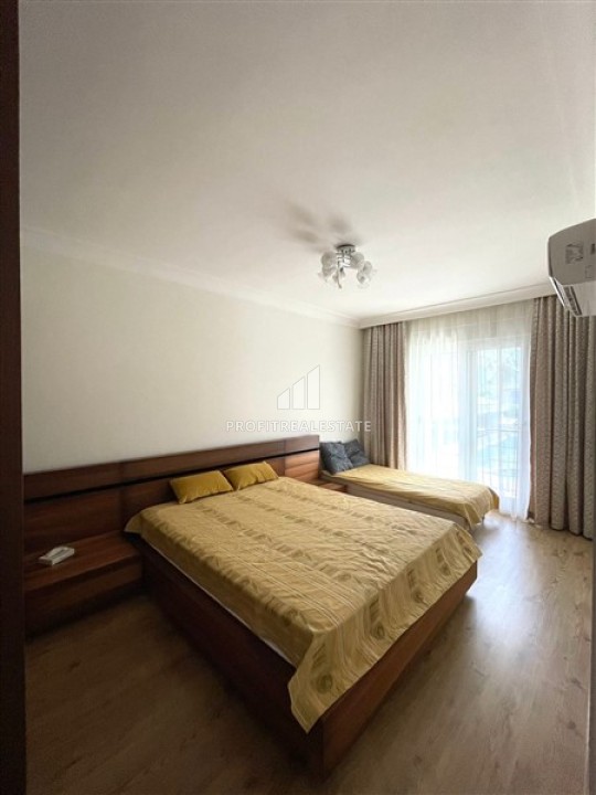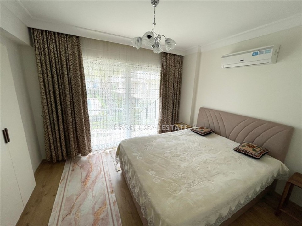 Дуплекс, планировки 2+1, находится на входном и первом этаже одного из трех блоков резиденции, сданной в эксплуатацию в 2011 году. Апартаменты, площадью 120м², представляют собой перевернутый дуплекс, т.е. вход расположен на верхнем этаже с двумя меблированными спальнями и общей ванной комнатой. Из обеих спален есть выход на просторный балкон. Элегантная деревянная лестница ведет на нижний этаж, где расположены гостиная, совмещенная с кухней американского типа и вторая ванная комната. В гостиной расположилась стильная мягкая мебель. Обеденная зона может разместить членов большой семьи. Кухонная зона находится несколько обособленно, в предназначенной ей нише. Здесь находится вместительный кухонный гарнитур с комплектом качественной бытовой техники. Обе ванные комнаты укомплектованы качественной мебелью и сантехникой. В дуплексе установлены кондиционеры во всех комнатах, в спальнях на полу ламинат, в остальных помещениях – керамическая плитка.