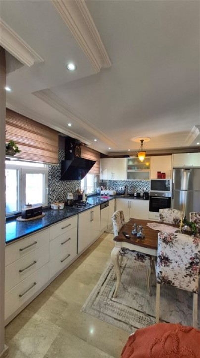 Продается квартира хорошей площади, полностью готовая к проживанию в районе Алании – Тосмур. Апартаменты площадью 110м² расположились на 8 этаже одного из блоков. В квартире имеются: просторный салон, объединенный с угловой кухней американского типа, две спальни, две оборудованные ванные комнаты, два просторных балкона с видом на красивую территорию комплекса и великолепные горы Торос. В салоне находится элегантная диванная группа, обеденная зона на 6 персон отделяет салон от кухонной зоны. Кухонный гарнитур укомплектован необходимой бытовой техникой. Спальни меблированы, в ванных комнатах установлена качественная сантехника и мебель для ванных комнат. Прихожая, которую все реже можно встретить в современных постройках, радует своими размерами и встроенным шкафом для верхней одежды.