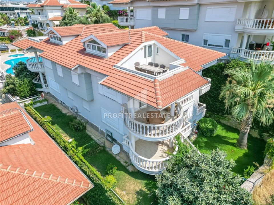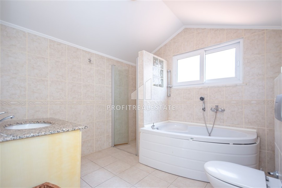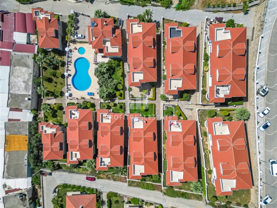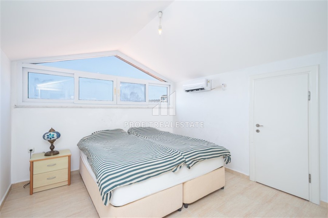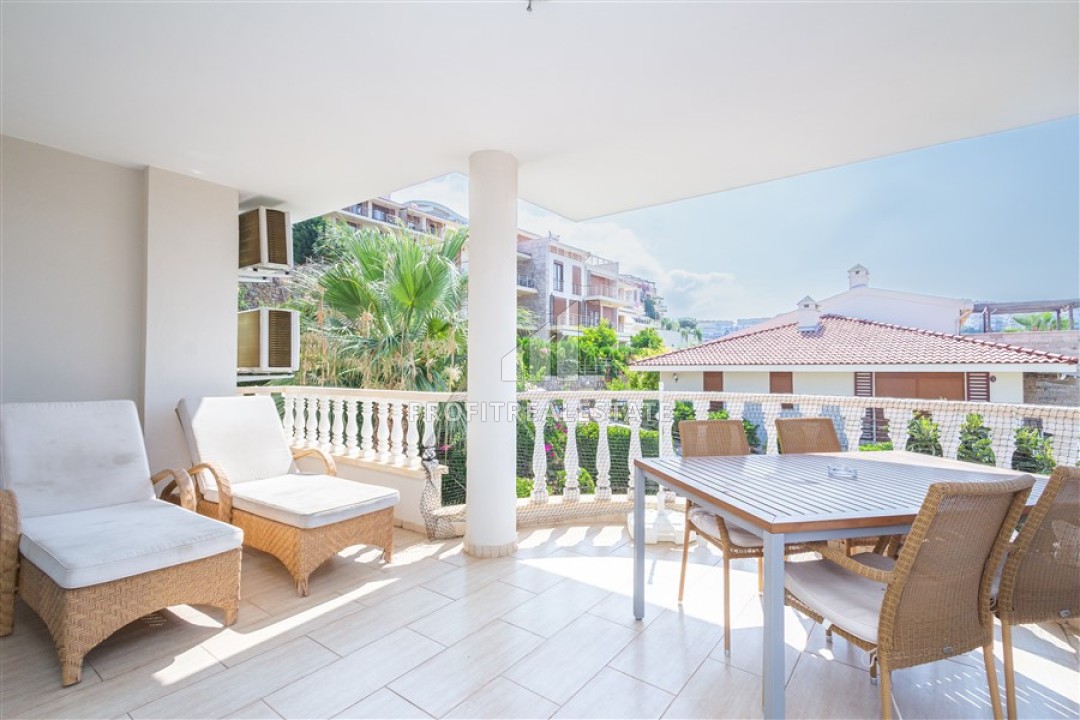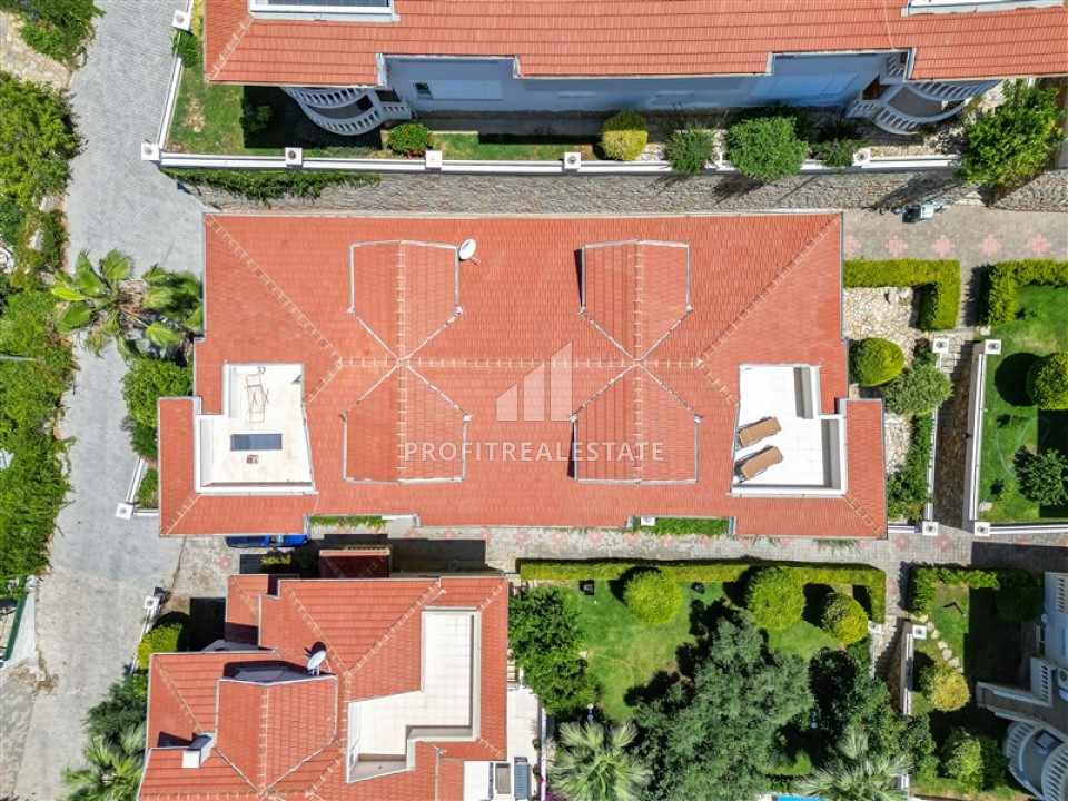 В этом чудесном месте, всего в 500м от побережья Средиземного моря собственником продается двухэтажная квартира 3+1, общей площадью 155м², расположенная в таунхаусе, построенном в 2006 году. Апартаменты располагают гостиной, объединенной с кухней открытого типа, укомплектованной необходимой мебелью и бытовой техникой. В зоне отдыха установлена симпатичная мягкая мебель. Кухонный гарнитур угловой, больших размеров. Рядом расположена обеденная зона на 6 персон. Из гостиной и кухни можно выйти на большой угловой балкон, где организована зона отдыха с удобной садовой мебелью. В квартире есть три меблированные спальни, две ванные комнаты, укомплектованные мебелью и сантехникой, причем в одной из них, помимо душевой кабины, установлена еще и ванна. Из спальни нижнего этажа можно выйти на второй просторный балкон. Удобная широкая гранитная лестница соединяет этажи. В холле верхнего этажа, перед выходом на большую видовую террасу, обустроена небольшая хозяйственная зона. Не лишним будет и кладовая с большим количеством места для хранения.