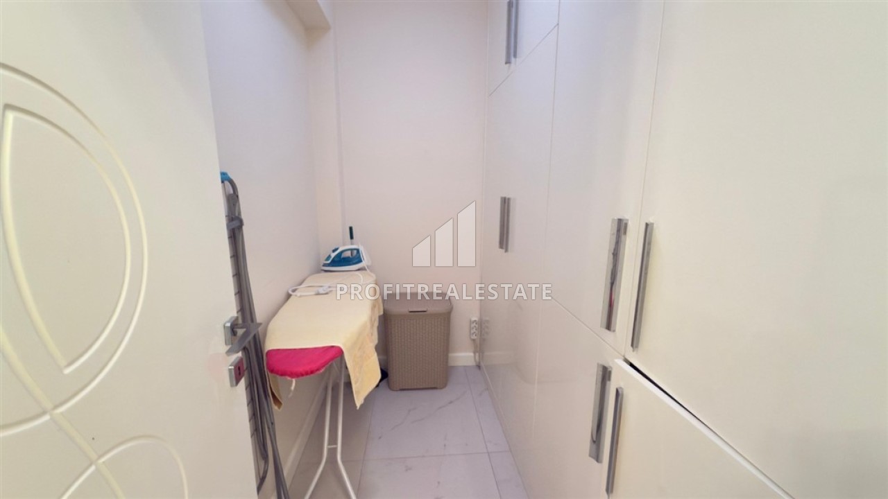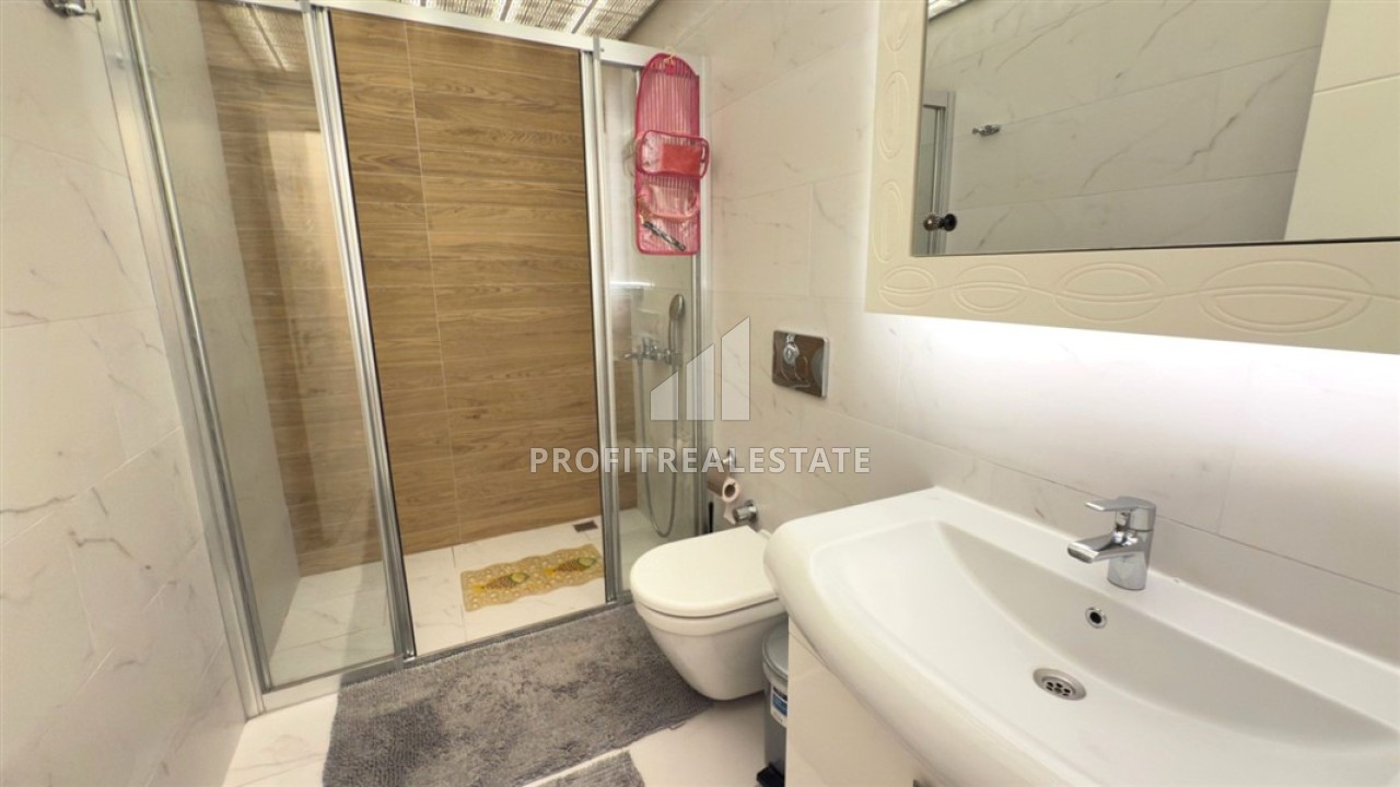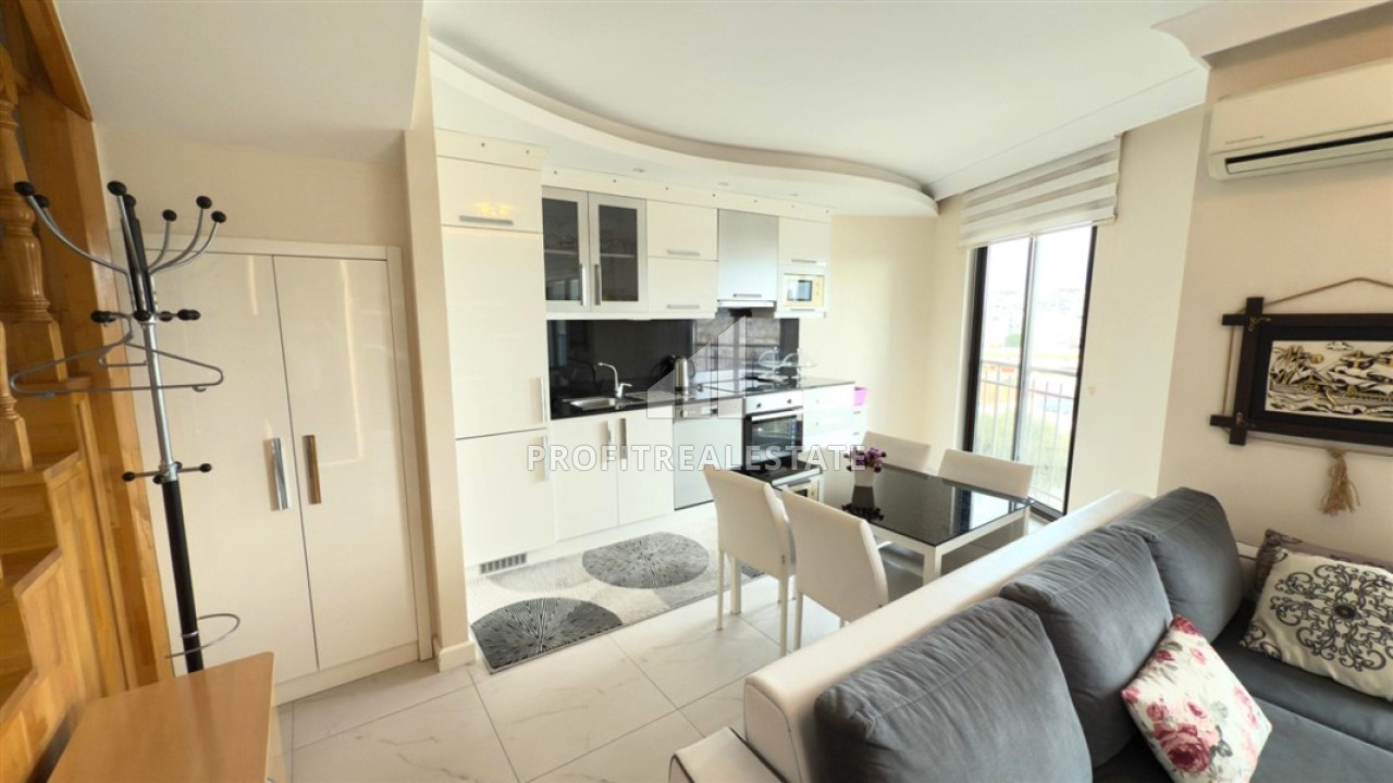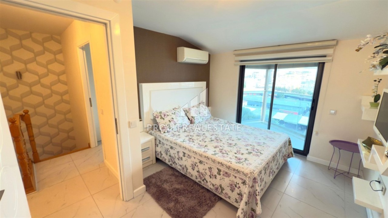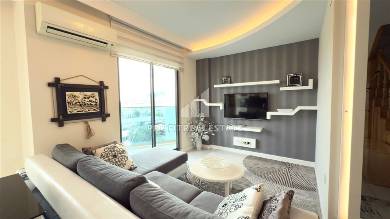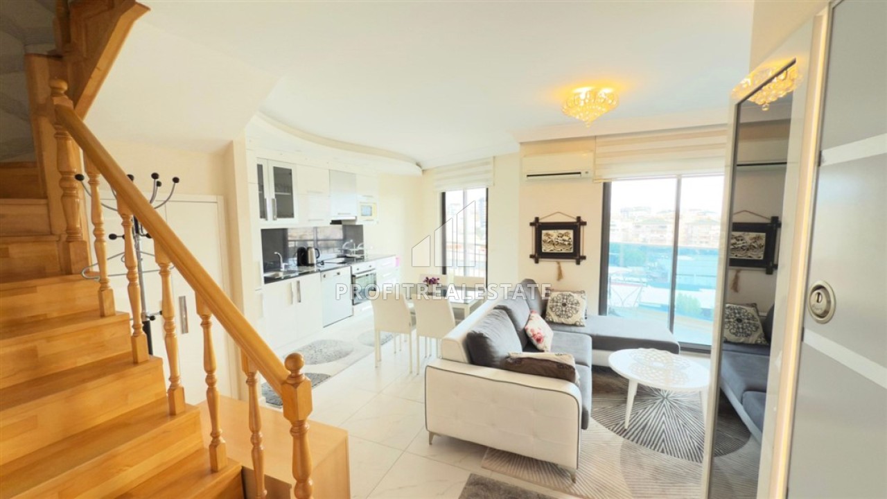 В ярком и гостеприимном, самом теплом городе Турции – Алании, в центре города выставлена на продажу уютная двухэтажная трехкомнатная квартира, площадью 98м². На нижнем этаже находится гостиная, объединенная с кухней американского типа, ванная комната и небольшая. входная зона с деревянной лестницей на верхний этаж. Здесь вас встретят две спальни и вторая ванная комната. В гостиной установлен большой угловой диван перед телевизором. Стильный кухонный гарнитур с качественной бытовой техникой разместился в кухонной зоне. Обеденная зона на 4-6 персон отделяет кухню от салона. Спальни меблированы, обе ванные комнаты с качественной сантехникой и мебелью для санузлов. Приятным бонусом станет вместительная гардеробная комната. Балконы и нижнего, и верхнего этажа подарят вид на горы и море на горизонте, Аланийскую крепость, особенно красивую с вечерней иллюминацией. Апартаменты уютные и готовы к проживанию, а их приобретение позволит новым владельцам претендовать на получение ВНЖ по праву собственности.