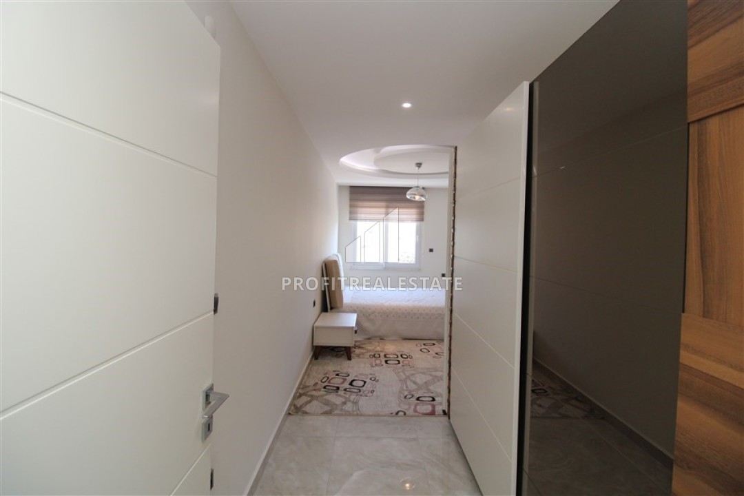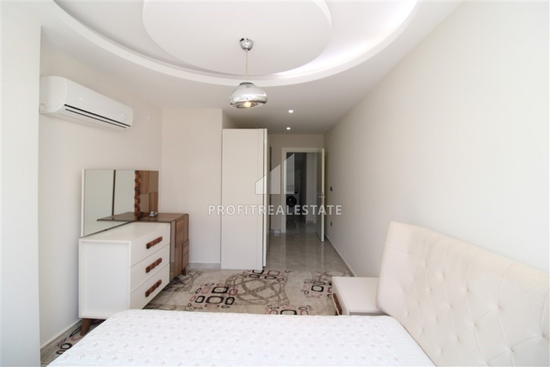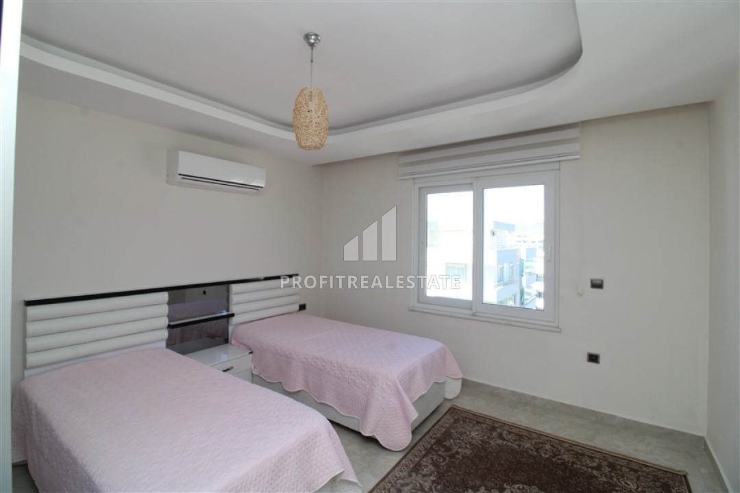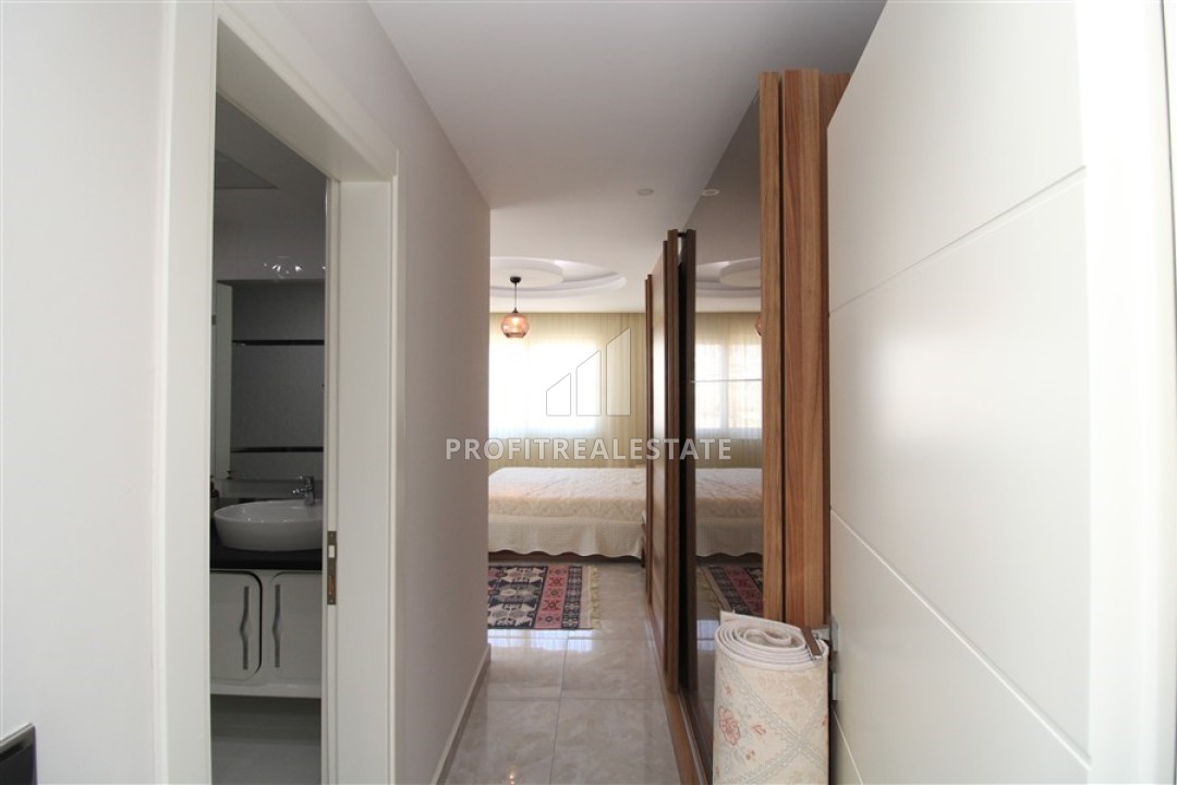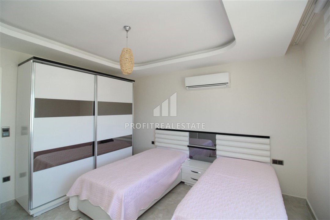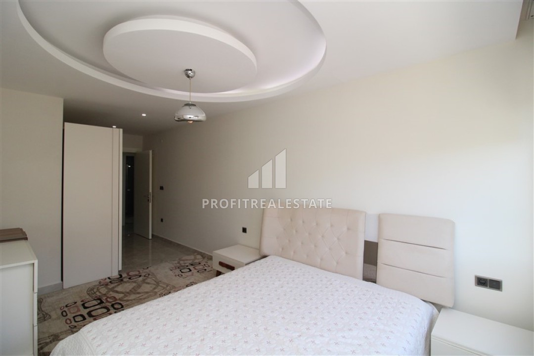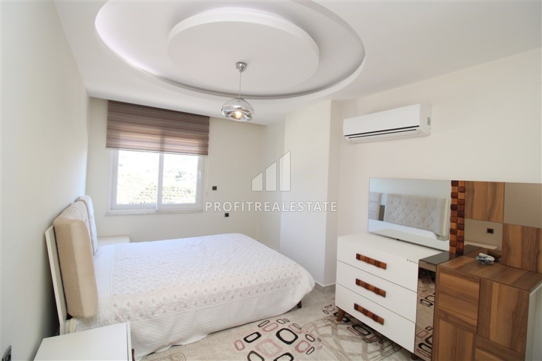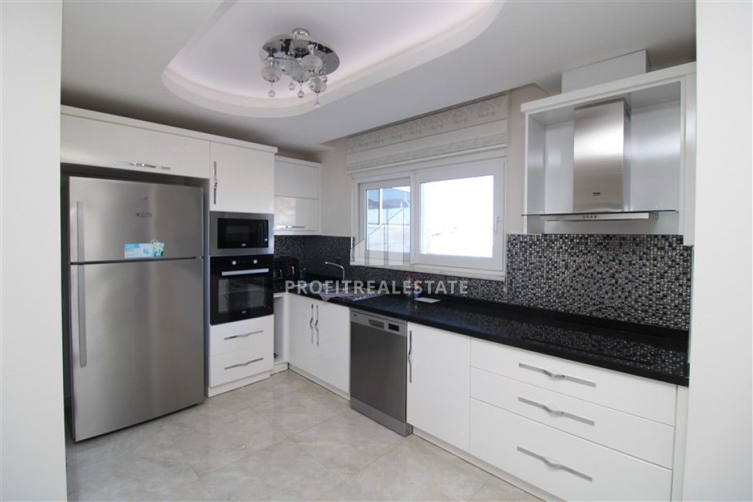 В гостиной установлена стильная мягкая мебель. Кухонная зона несколько отелена от салона и находится в своеобразной нише. Кухонный гарнитур с гранитной столешницей, большим количеством шкафов укомплектован необходимой бытовой техникой. Спальни располагают качественной мебелью. Особенностью большой террасы, с уютной зоной отдыха, является потрясающий вид на бескрайние просторы Средиземного моря с Аланийским полуостровом и старинной крепостью, могущественные горы, вершины которых зимой покрываются снегом и великолепно выглядят на фоне синего неба и изумрудных склонов.