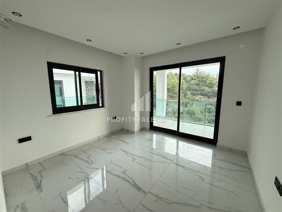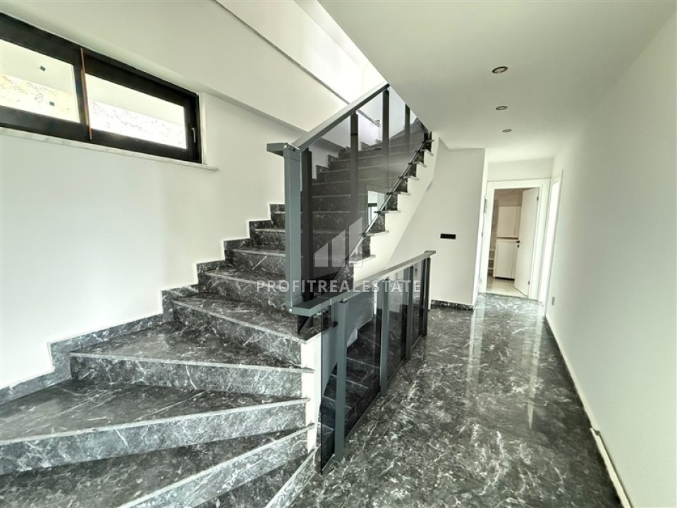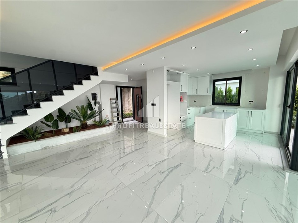 Трехэтажная вилла имеет планировку 3+1, общая площадь составляет 330м². Это современная вилла в эксклюзивном архитектурном стиле и дизайне с использованием высококлассных материалов и передовых технологий. Панорамные окна дают естественное освещение, наполняют виллу светом и теплом. За современным фасадом скрывается продуманное до мельчайших деталей пространство. Первый этаж занимает гостиная с панорамным остеклением, объединённая с кухней, которая находится несколько обособленно от салона, в отведенном ей пространстве. Кухня со стильной кухонной мебелью и кухонным островом. На этом же этаже находится прихожая с первой ванной комнатой. Элегантная лестница из салона ведет на верхние этажи. Второй этаж занимают три просторные спальни, каждая со своим балконом, а одна из спален располагает приватной ванной комнатой. Общий санузел находится в холле. Весь третий этаж отдан огромной мастер-спальне с личной ванной комнатой, огромной гардеробной зоной и великолепной террасой.