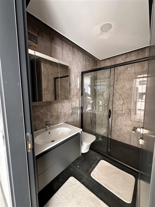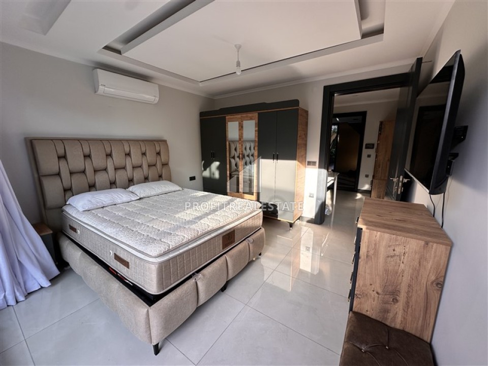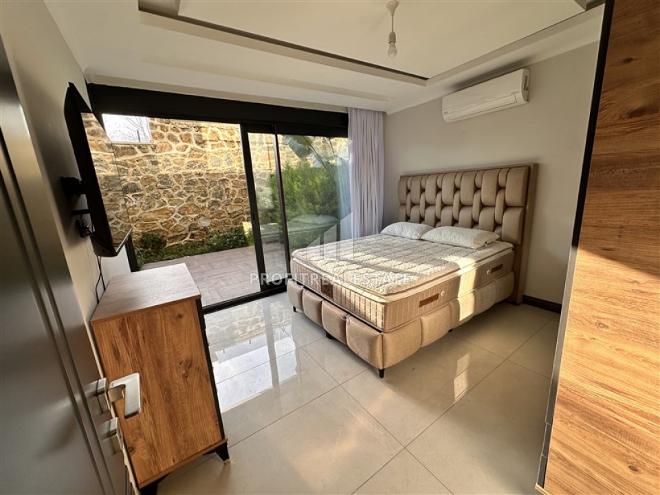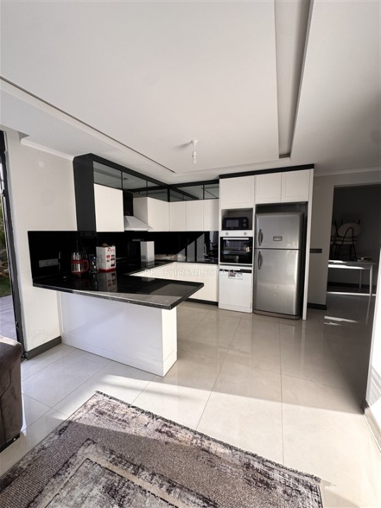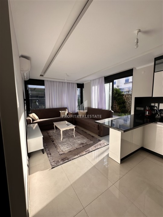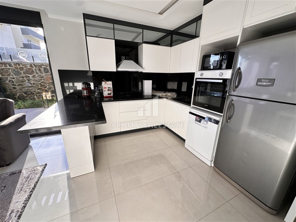 Планировка предусматривает гостиную-студию, объединенную с кухней американского типа, две спальни, одну ванную комнату и хорошую прихожую. Из гостиной и главной спальни есть выход на террасу в сад. Здесь можно обустроить уютную зону отдыха. В апартаментах, ведущим дизайнерским бюро Алании, сделан элегантный интерьер, который покорит с первой минуты.