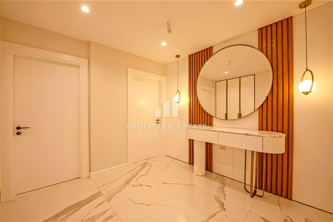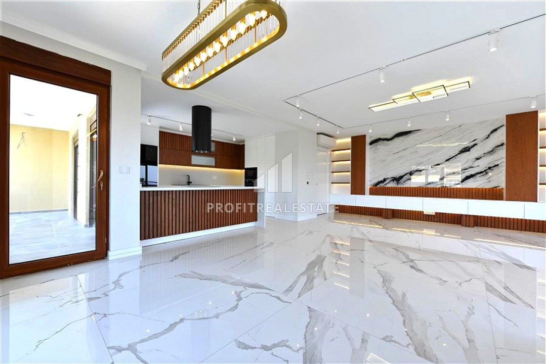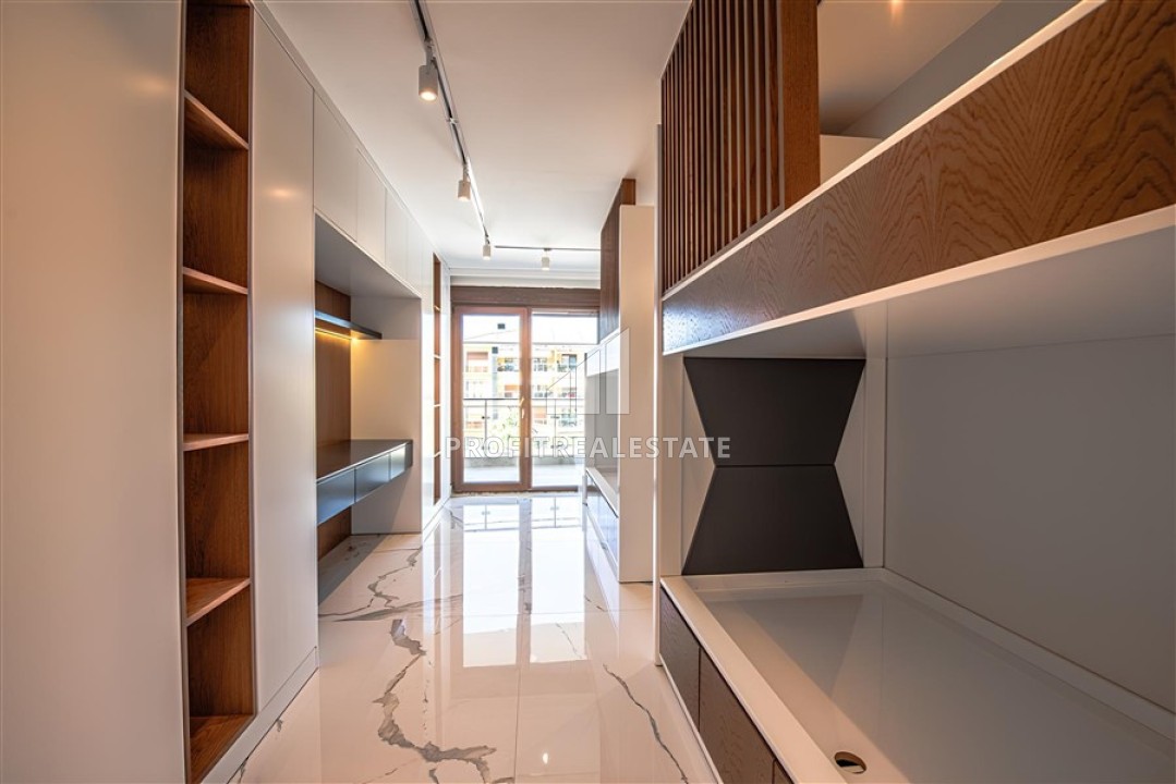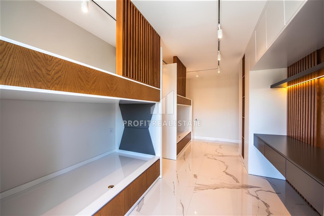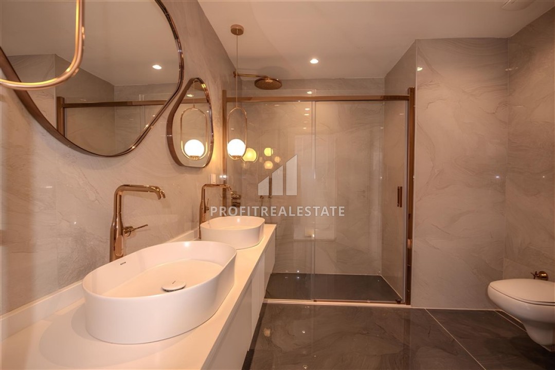 Планировкой квартиры предусмотрены: огромная гостиная, объединенная с кухней американского типа, четыре спальни, прихожая и две ванных комнаты. В гостиной панорамные окна подарят вид на море. Кухонная зона располагает удобным вместительным гарнитуром и кухонным островом, укомплектована всей необходимой бытовой техникой. Четыре спальни имеют выходы на балконы, две ванные комнаты укомплектованы качественной современной сантехникой, причем в одной установлена душевая кабина, а во второй – ванна. В просторной прихожей разместился вместительный встроенный шкаф для верхней одежды. С двух больших балконов открывается великолепный вид на бескрайнее Средиземное море, Аланийскую крепость, горы Торос и территорию комплекса с бассейном. Изюминкой апартаментов является наличие подогрева полов и установленная система «умный дом».