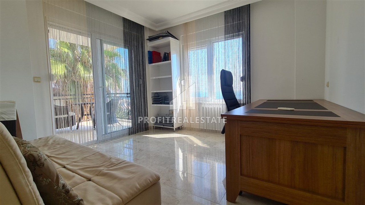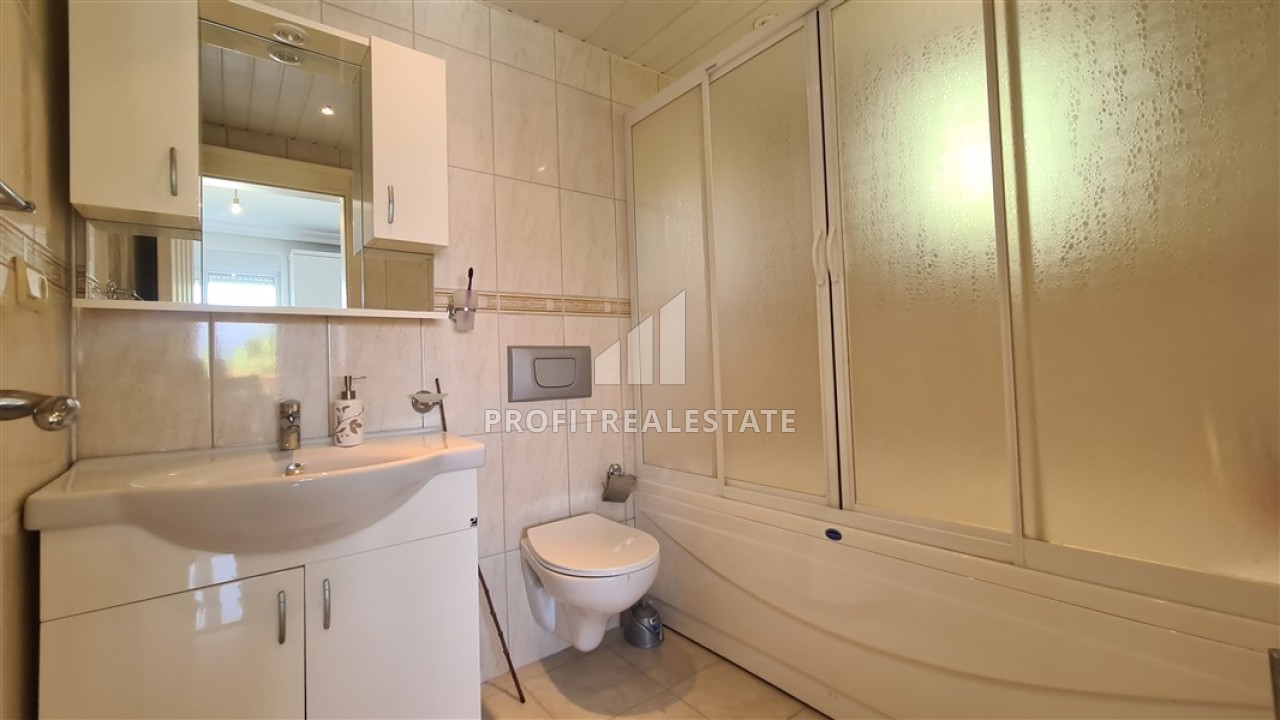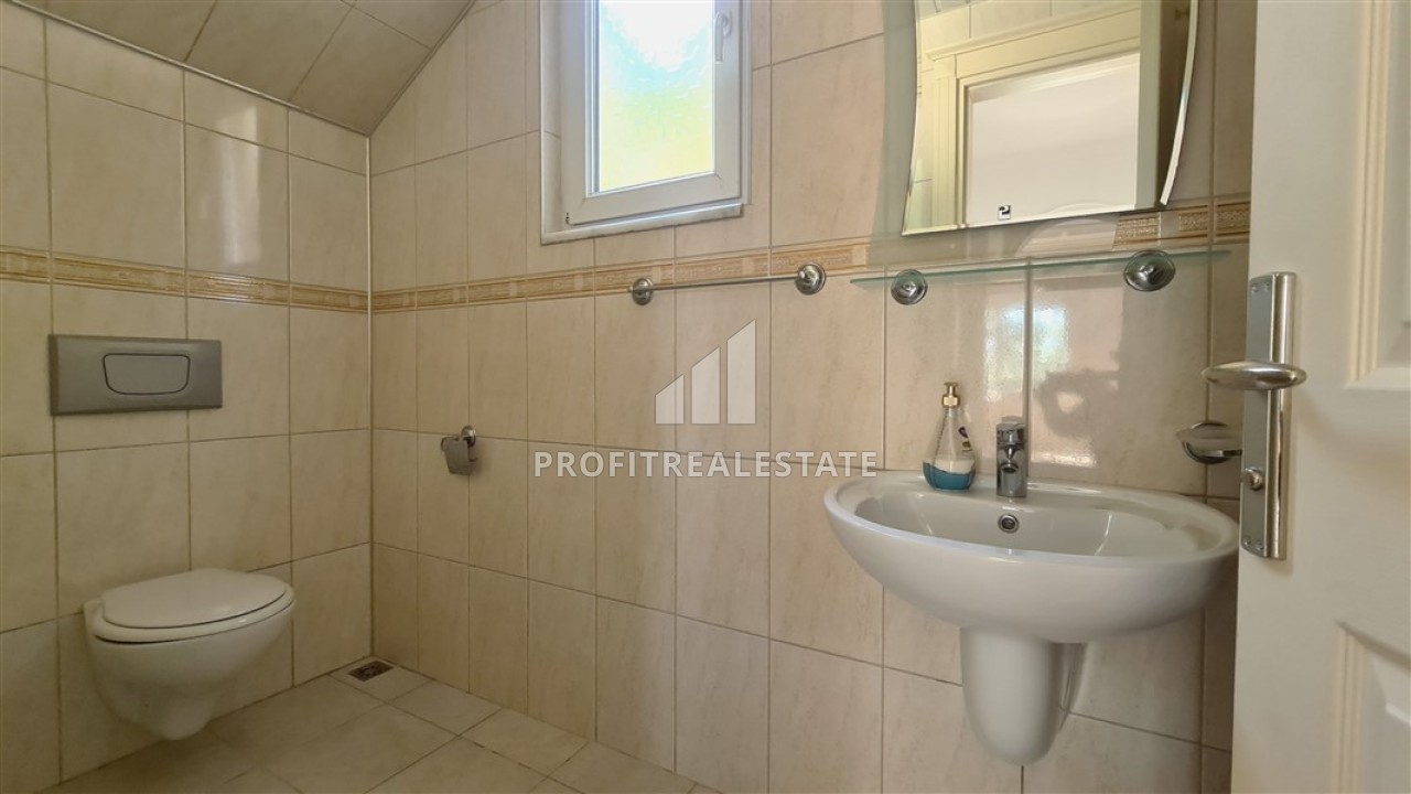 Двухэтажная вилла имеет планировку 3+1, общая площадь составляет 200м². Планировкой предусмотрено наличие просторной гостиной, объединенной с кухней американского типа, трех спален, двух ванных комнат, гостевого санузла, хорошей прихожей и двух балконов, с которых открывается завораживающий вид на, покрытые изумрудной зеленью, холмы Торосских гор, Аланийский полуостров и Средиземное море. По этажам помещения распределились следующим образом: на нижнем этаже находится гостиная с кухней и выходом на балкон, прихожая с лестницей на второй этаж и гостевым санузлом без душевой кабины. Изюминкой гостиной является действующий камин, вокруг которого так приятно будет коротать вечера в кругу друзей и домочадцев. На втором этаже находятся три спальни (на фото одна из них меблирована как кабинет и имеет личный балкон). В холле расположена общая ванная комната с душевой кабиной, а главная спальня располагает приватным санузлом с ванной.