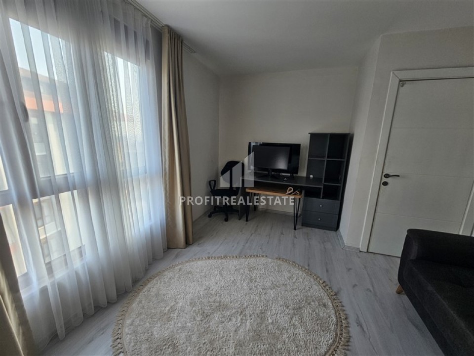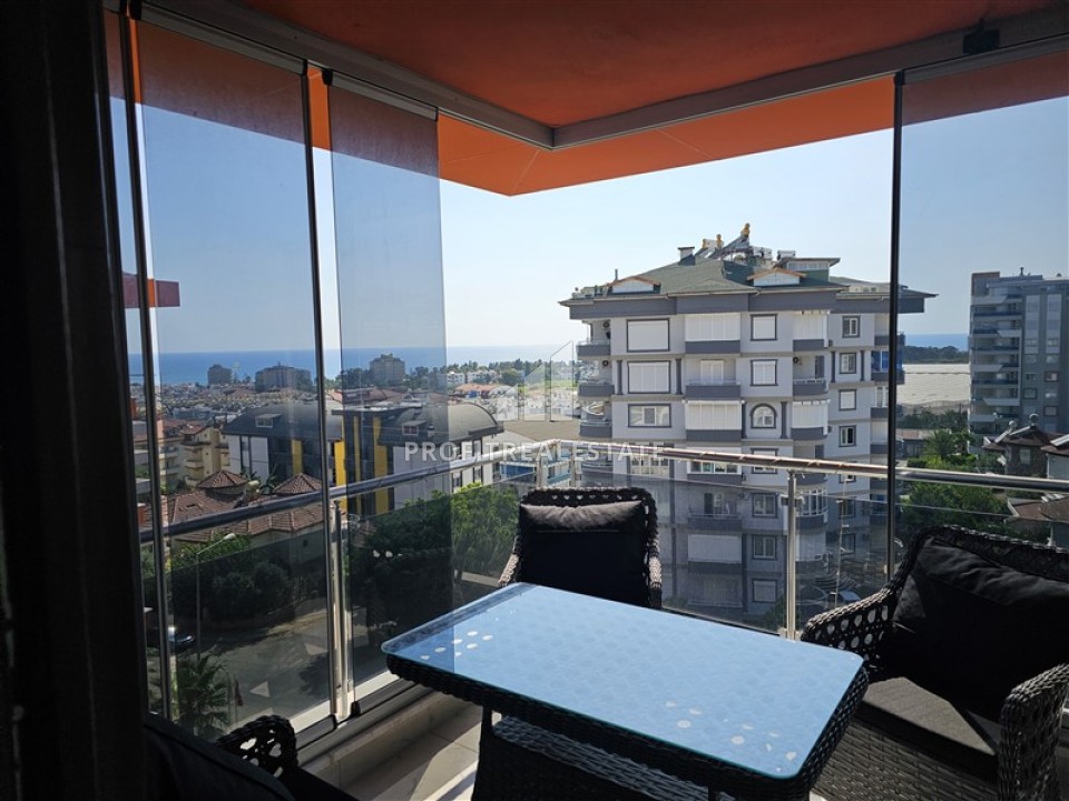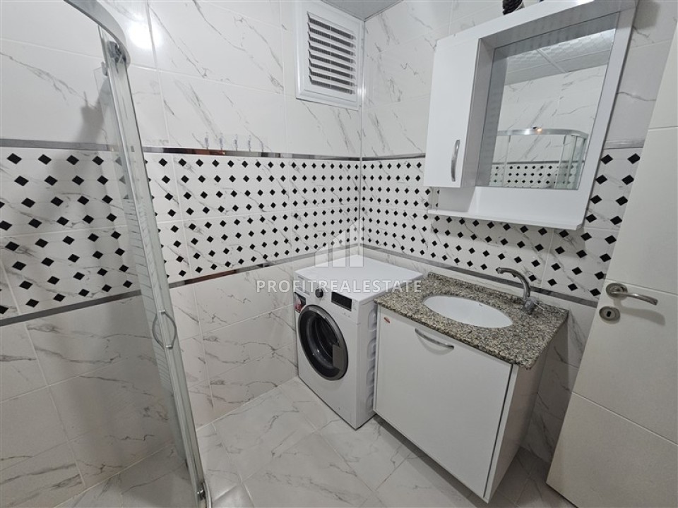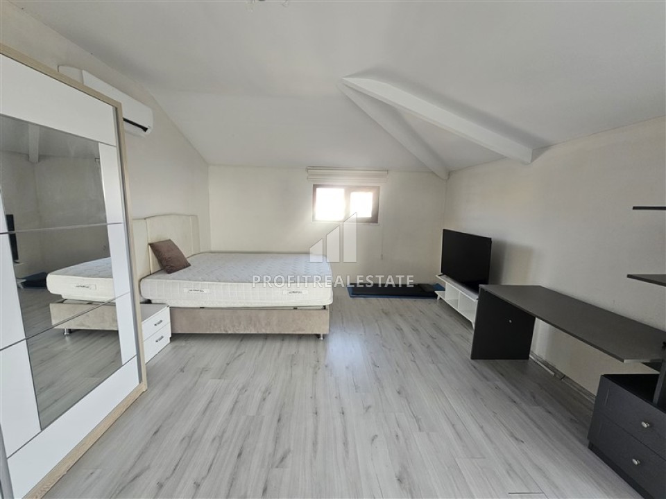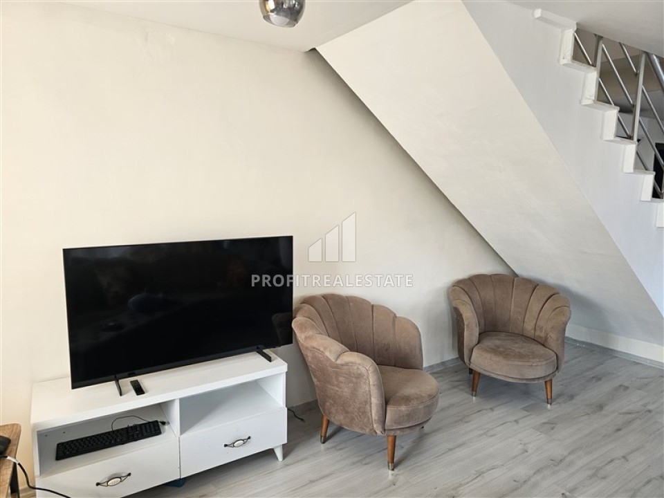 На нижнем этаже пентхаус имеет уютную гостиную с элегантной мягкой мебелью, объединенную с кухней американского типа со всей необходимой бытовой техникой и местами для хранения посуды, симпатичная обеденная зона отделяет кухню от зоны отдыха. Одна меблированная спальня находится на этом же этаже. В прихожей расположена первая, общая, ванная комната и лестница, соединяющая этажи. На верхнем этаже апартаментов разместились две меблированные спальни очень больших размеров и вторая ванная комната. Ванные комнаты укомплектованы необходимой мебелью, сантехникой, причем в одной из них установлена ванна, а во второй - душевая кабина. Пентхаус располагает просторным балконом на нижнем этаже и двумя прекрасными террасами на верхнем, и если установить там садовую мебель, то можно наслаждаться видом на море и горы за чашкой крепкого турецкого кофе.