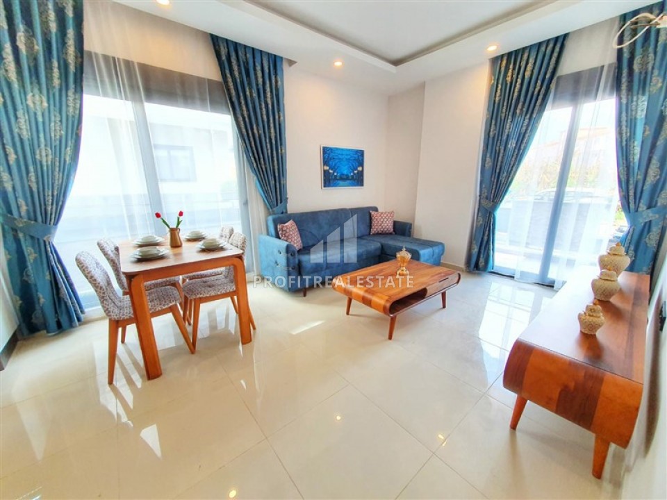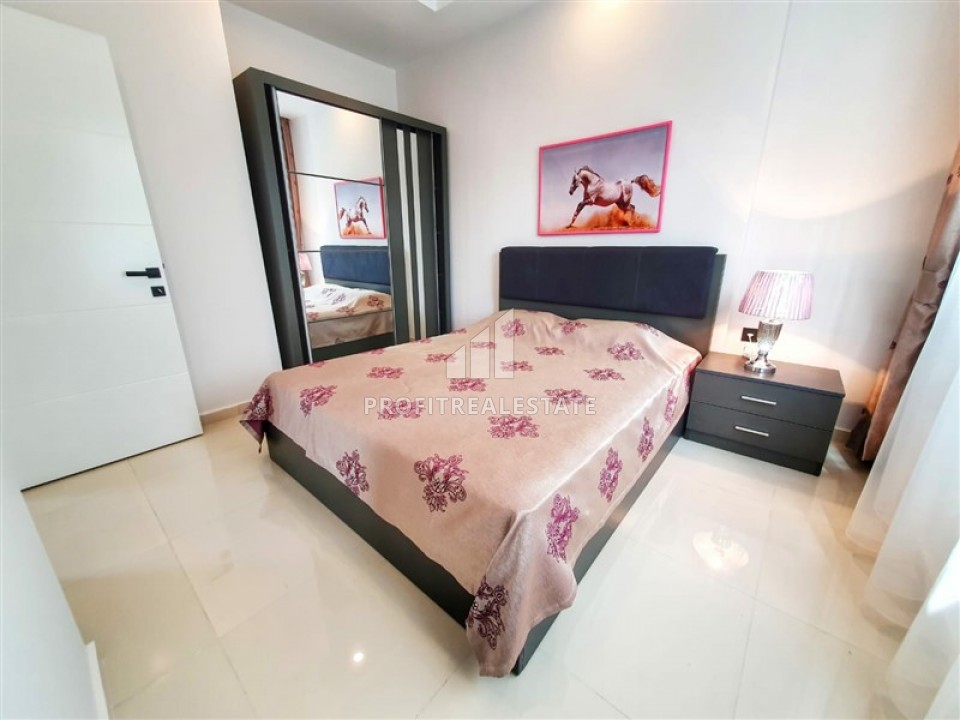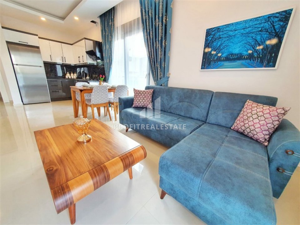 На продажу от собственника выставлена двухкомнатная квартира, общей площадью 50 м2, полностью меблированная. Она является частью новой резиденции, построенной в 2021 году, на расстоянии 400 метров от моря и 300 метров от центра Махмутлара. Квартира отличается удобной планировкой и грамотной эргономикой пространства, которые, даже при небольшой площади, делают жилое помещение комфортным для проживания. Апартаменты включают в себя спальную комнату, салон с кухней, ванную комнату и балкон. Здесь выполнена чистовая отделка, установлены большие окна в пол, визуально увеличивающие пространство, а двухуровневые потолки оснащены комбинированным освещением. Кроме того, как мы уже упоминали ранее, апартаменты полностью укомплектованы стильной мебелью и бытовой техникой. Все это, включая элементы декора, уже входит в заявленную стоимость.