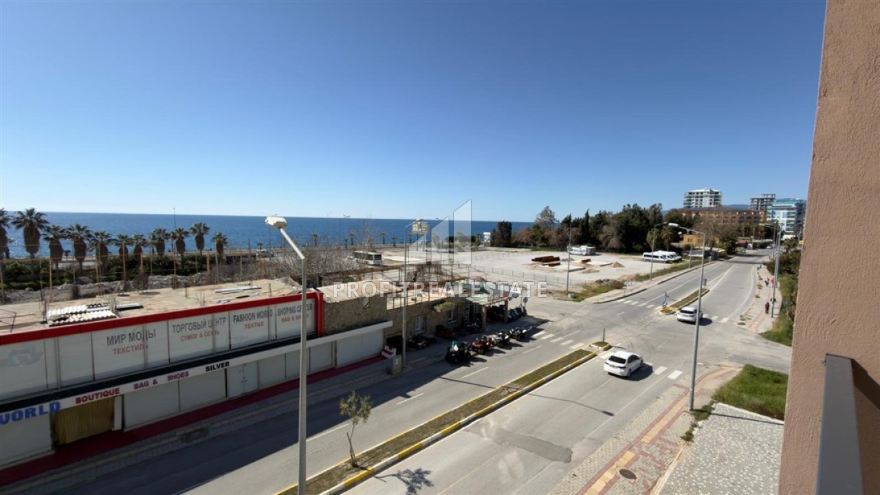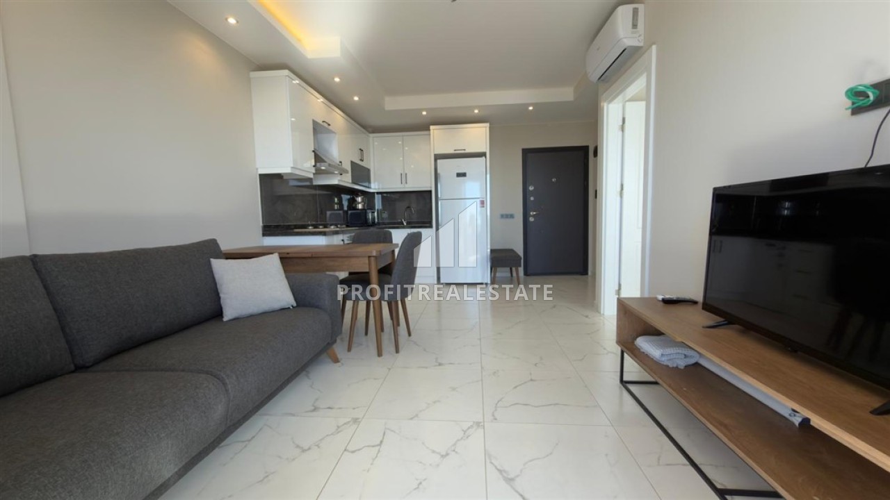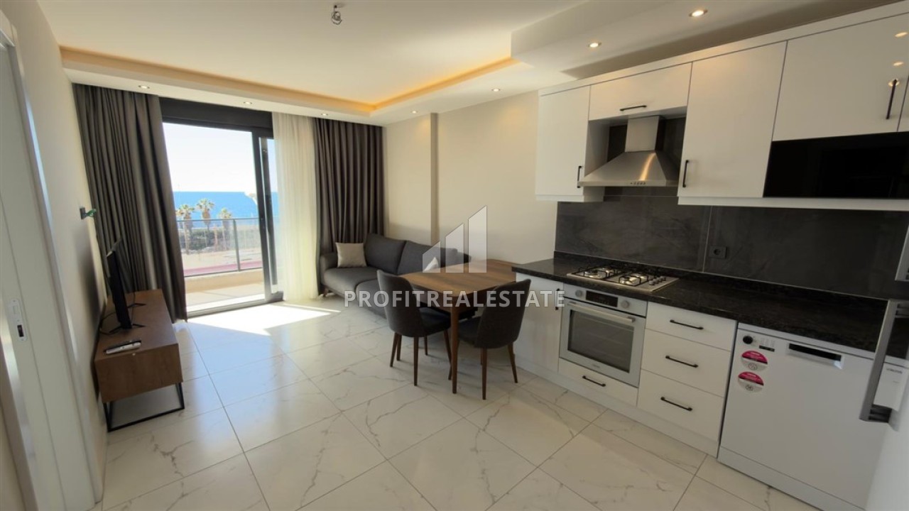 Квартира, планировки 1+1, имеет площадь 53м², имеет просторную гостиную, совмещенную с кухней американского типа, одну спальню, одну ванную комнату и один балкон с потрясающим открытым видом на Средиземное море. В гостиной установлена элегантная мягкая мебель и обеденная зона. Спальня меблирована, ванная комната укомплектована качественным сантехническим оборудованием. В стоимость квартиры входит: чистовая отделка из высококачественных материалов, встроенный кухонный гарнитур, межкомнатные двери, домофон, полностью укомплектованная ванная комната, кондиционеры, бытовая техника и полный комплект мебели, представленный на фото.